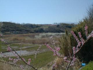 2000年4月11日境川農場の土手の桃の花がほぼ満開、写真の中央に白いスモモの花が見えます。