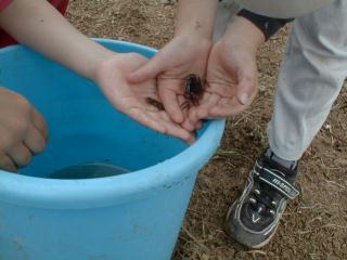 2001年4月29日、境川農場は、ビニールの被覆作業中でした。 子供たちは、農場周辺のせせらぎで、オタマジャクシやサワガニを見つけました。