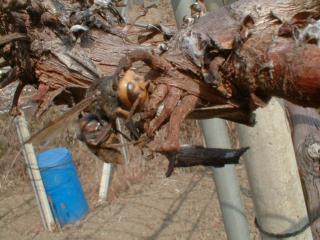 2002年1月16日、境川農場で剪定の作業中、毎年恒例の?もずの早贄(はやにえ)を見つけました。ブドウ棚の針金ではなく、気根(たまに見かける地上部に出た根)にきれいに突き刺さったスズメバチは、かなり珍しいです。