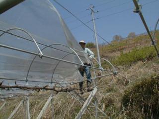 18m×54mなので10aを張るのに4人で約一日かかりましたが、ムクドリは、集団で襲ってくるので被害も多く、どうしてもこの時期にやらなければなりません。