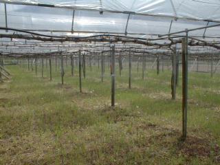 甲府上阿原第一農場のデラウエアに防鳥網を張りました。デラウエアは、7月中下旬に収穫を迎えますが、ムクドリの被害が多く、3年前からブドウ棚の上50cmのところに網を張りました。