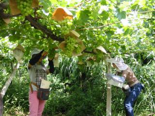 写真は、境川農場のピオーネの房作りの様子です。