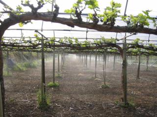写真は、境川農場のピオーネをマイクロスプリンクラーでかん水している様子です。