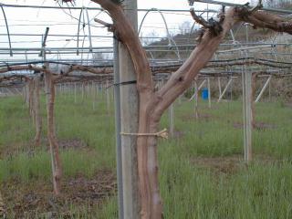 ブドウ棚の太い針金に幹を一直線に縛り、芽が出るのを待ちます。甲府のデラウエア種などはもう芽がだいぶ大きくなっていますが、ここではまだ、剪定した跡の切り口から樹液が落ちてくるのを確認していません。