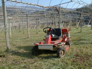 乗用モアでライ麦を刈り取りました。10アール(300坪)あたり約2000Kgの有機質を土に返したことになります。草を生かして作物を育てるので草生栽培と言います。ライ麦が再生してからもう一度刈り取りライ麦草生から雑草草生へ移行し’98年産のように一年中耕さない年もあります。