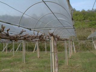 昨年、使用したものを使いました。出来ればもう一年使いたいと思っています。雨よけの部分は、1.5mで、この栽培方式だとブドウの房が収穫までほとんど雨に当たらないので、病気の発生も少なくなります。