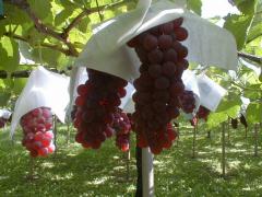 デラウエアとベリーAを強制摘心による短梢剪定と自然形長梢剪定で栽培しています。40アール借地で甲府の南東にある砂地の早場地帯です。共同経営時代を含め、10年以上管理をしています。この10年間、除草剤を使わず有機質肥料を中心に極めて少ない肥料設計(平均すると通常の3分の一以下)で、草生栽培をしています。また、農薬の使用回数、散布量とも少ない状態が続いています。今年約20アールを伐採し、100本のベリーAの苗木を植えつけました。